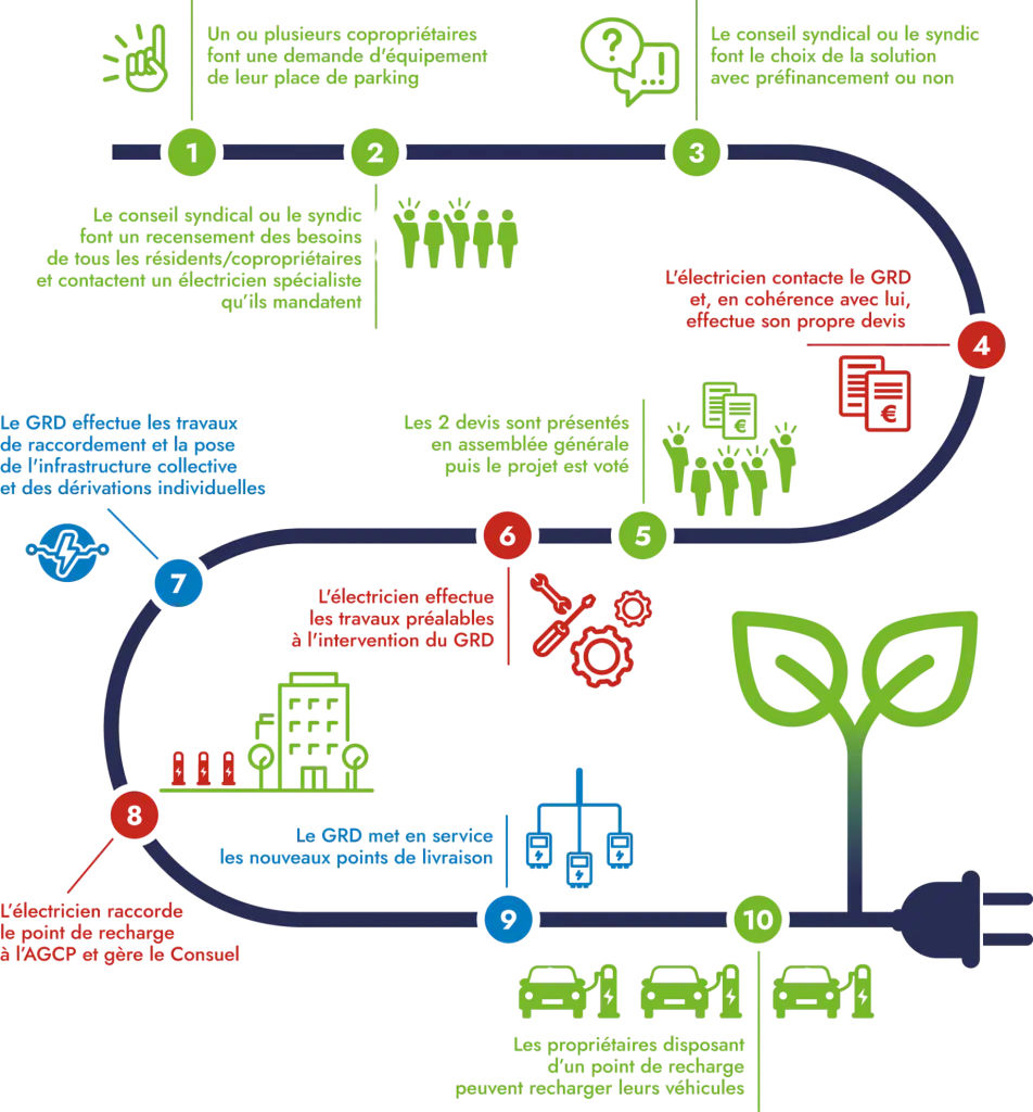 - Enedis avance la totalité des coûts d’infrastructure ; seuls les copropriétaires qui s’équipent paient une quote‑part (410 € HT mini / 2 038 € HT maxi, plafonds indexés).